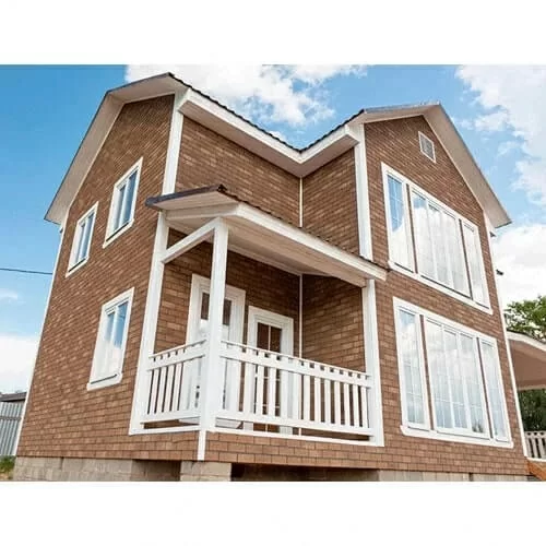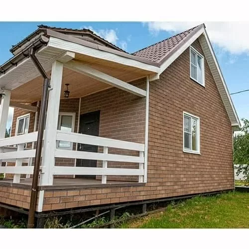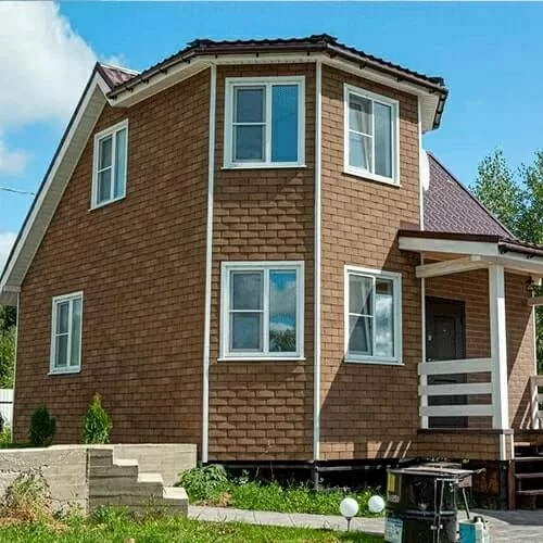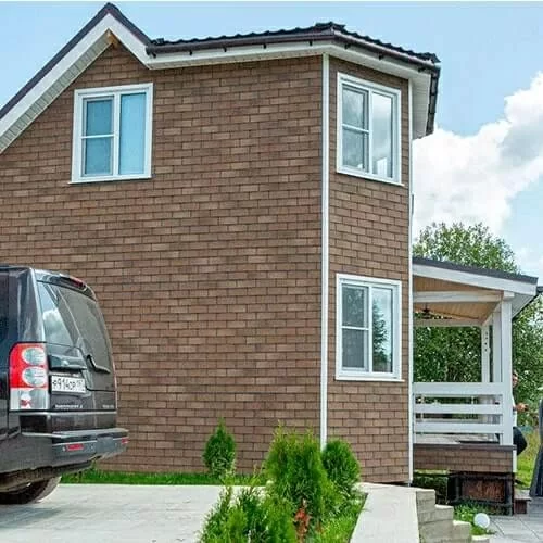При помощи плитки фасадной Хауберк выполняют облицовку фасадов строений из дерева, пено- и газоблоков, а также заборов и ограждений. Фасадную плитку ТЕХНОНИКОЛЬ HAUBERK используют и для декоративного оформления входных групп и фронтонов.