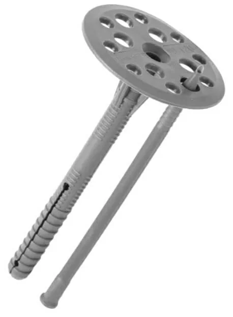 Крепеж состоит из дюбеля с двухсегментной распорной частью, увеличенной прижимной шайбой и пластикового гвоздя. Дюбель применяется для крепления теплоизоляционных материалов к бетону, полнотелому и пустотелому кирпичу, камню, пенобетону.