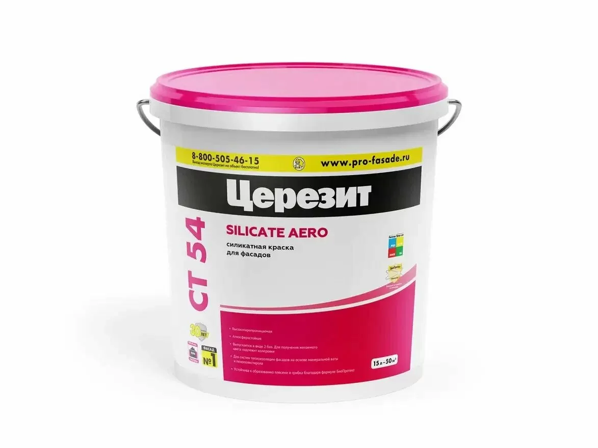 Церезит CT54 - это силикатная краска выполненная на основе водной дисперсии жидкого калиевого стекла. Поставляется в виде белой базы под колеровку.