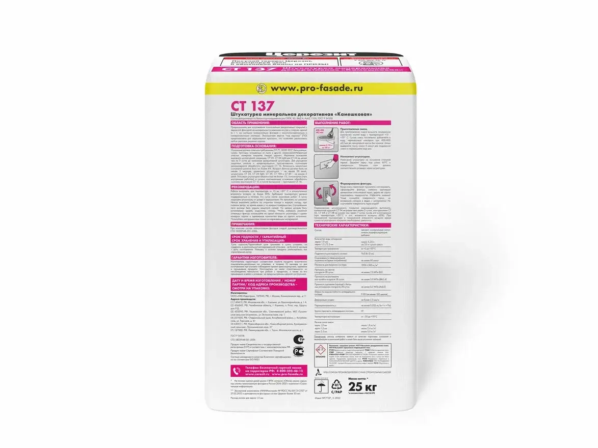 Смесь Церезит СТ 137 поставляется в прочном многослойном мешке весом 25 кг. Хранить продукцию следует на поддонах в сухом месте.