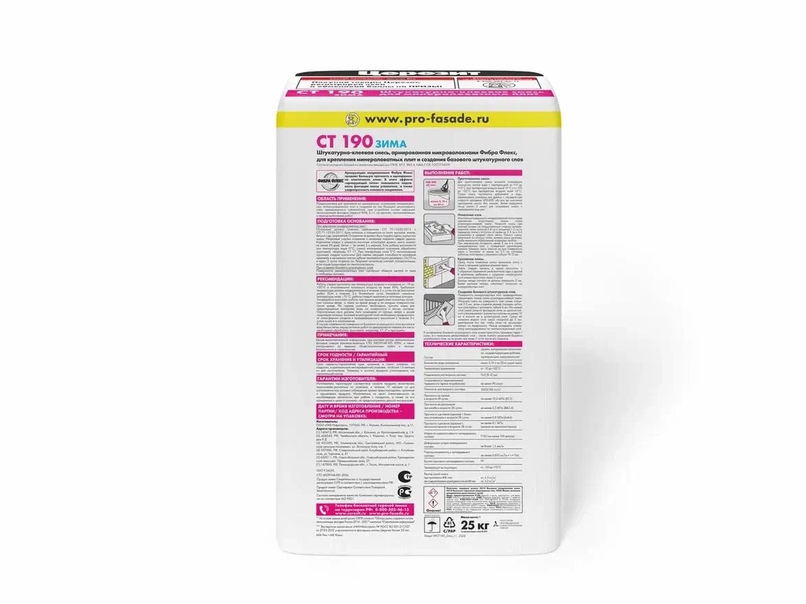 Клей для минераловатных плит Церезит CT 190 реализуется в прочных многослойных мешках фасовкой по 25 кг. Рекомендуется хранение продукции на поддонах в герметичной оригинальной упаковке не более 12 месяцев с даты производства.
