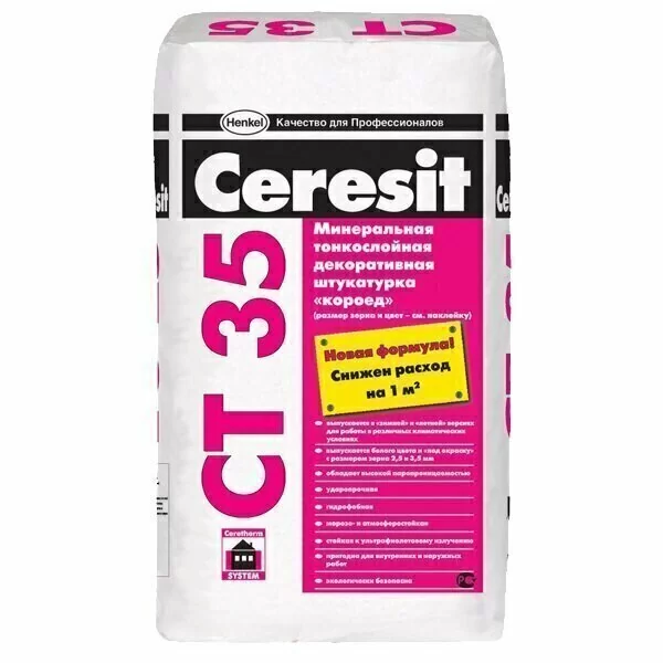 В состав фасадной штукатурки Церезит CT 35 входят цемент, минеральные заполнители и полимерные модификаторы.