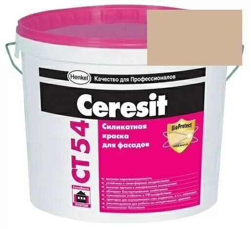 Силикатная краска СТ 54 от производителя Ceresit состоит из водно-дисперсионной смеси сополимеров акрилатов и силиконов, минеральных наполнителей, пигментов и жидкого калиевого стекла. Колеровка данного изделия производится по системе Ceresit Colour System (CCS). Силикатная составляющая (жидкое стекло) обеспечивает краске прочное сцепление с минеральным основанием, что в свою очередь продлевает срок службы цветного покрытия.