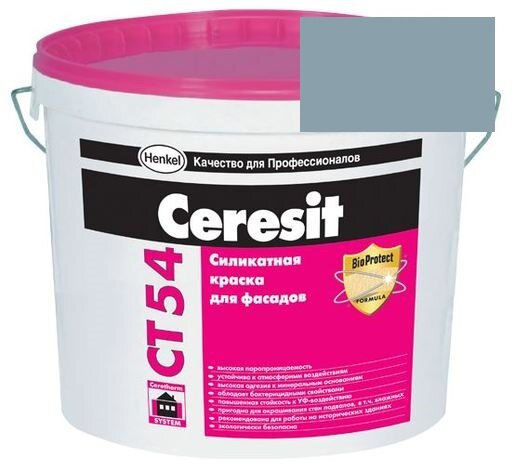 Силикатная краска СТ 54 от производителя Ceresit состоит из водно-дисперсионной смеси сополимеров акрилатов и силиконов, минеральных наполнителей, пигментов и жидкого калиевого стекла. Колеровка данного изделия производится по системе Ceresit Colour System (CCS) и имеет оттенок ATLANTIC 6. Силикатная составляющая (жидкое стекло) обеспечивает краске прочное сцепление с минеральным основанием, что в свою очередь продлевает срок службы цветного покрытия.