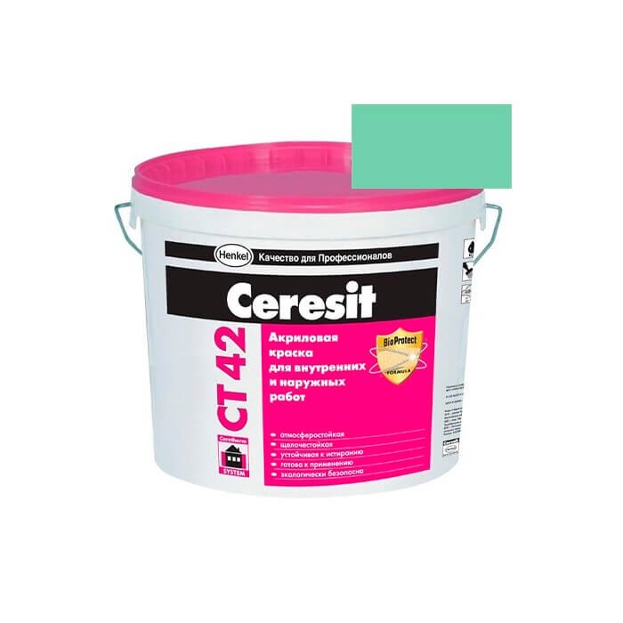 Ceresit СТ 42 используется для покраски стен внутри зданий и снаружи (фасады). Применяется для окрашивания бетонных стен, гладкой или фактурной штукатурки. Не использовать для покраски пола. Покраска поверхностей производится в два этапа с разницей в 4-6 часов.