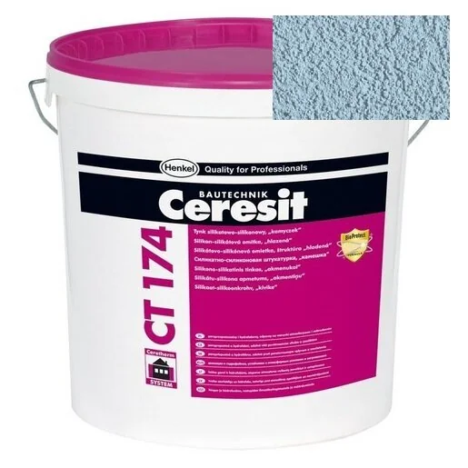 Штукатурка Ceresit CT 174 представляет собой стройматериал на базе водной дисперсии с добавлением наполнителей и пигментов. Изделие колеровано в оттенок «PACIFIC 3».