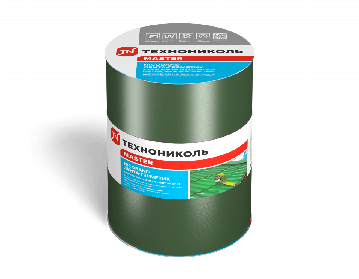 Лента-герметик марки NICOBAND состоит из нескольких слоев. Первый представляет собой цветное покрытие, оснащенное УФ-защитой. Второй слой – герметизирующий. Третий – защитная пленка. Материал выполнен в зеленом цвете. Длина ленты составляет 10 м, а ширина – 20 см.