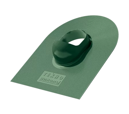 Проход через кровлю – это небольшое полипропиленовое изделие, предназначенное для установки выходов вентиляции и канализации на крыши из гибкой черепицы. Данный проходной элемент ТехноНИКОЛЬ выполнен в зеленом цвете.
