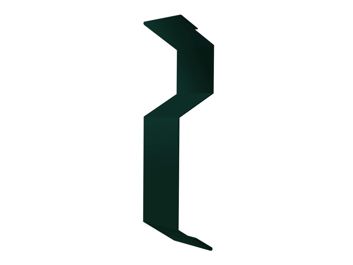 Планка примыкания внакладку – этот элемент накрывает верхнюю часть прижимной планки и фиксирует ее. После крепления угловой зазор, образуемый специальным отгибом, заполняется герметиком. Благодаря этому полностью исключается попадание влаги между стеной и примыкающей кровлей. Имеет покрытие из полиэстера с пленкой RAL 6005 – зеленый мох, поверхность Satin. Монтаж прост и не требует специальных навыков, производится с помощью саморезов на дюбеля.