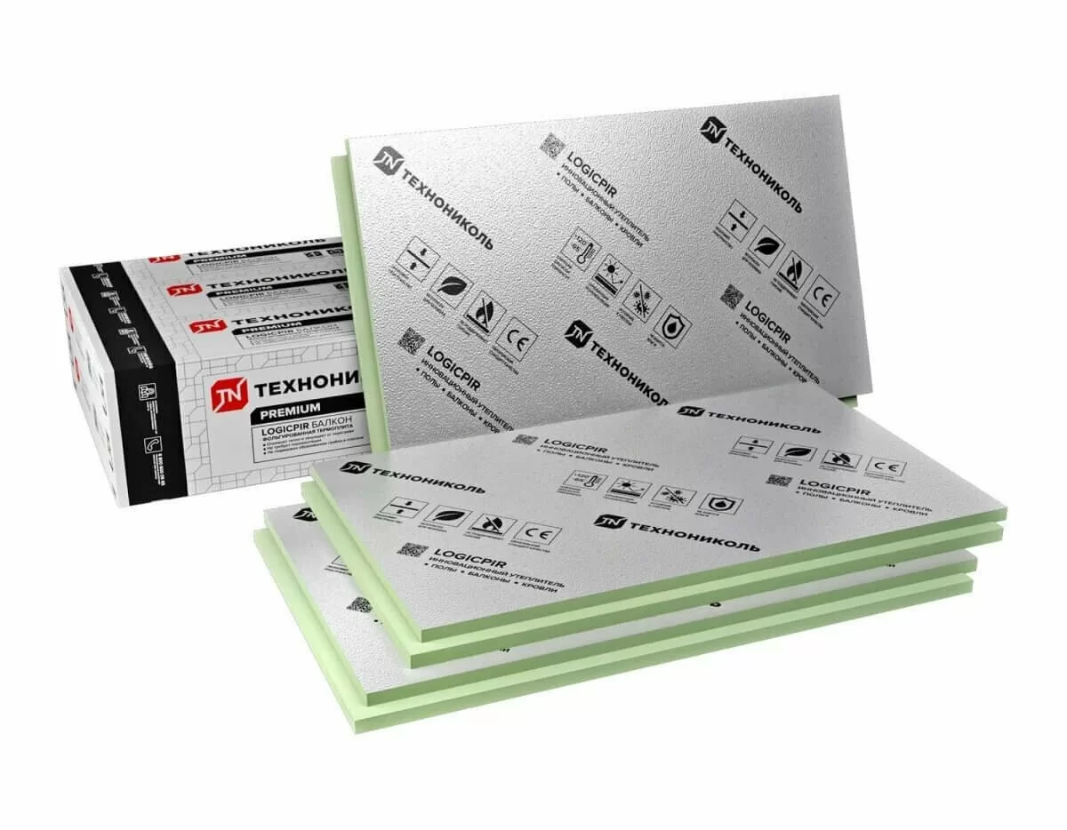Утеплитель LOGICPIR Балкон ТЕХНОНИКОЛЬ производится на основе пенополиуретана с двухсторонним фольгированным покрытием. Для эффективной герметичности стыки плит при монтаже проклеиваются алюминиевым скотчем.