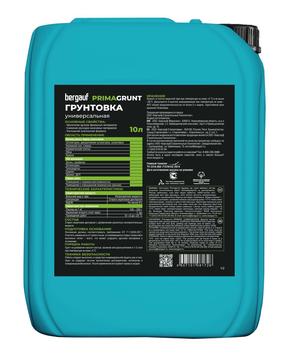 Грунтовка BERGAUF Primagrunt поставляется в пластиковых ведрах. Хранить материал следует в оригинальной таре, с герметично закрытой крышкой при t от +5° до +35° C. Допустимо непродолжительная заморозка при t от –40° C. Срок хранения — 18 месяцев.